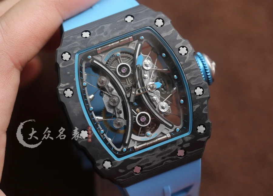 腕表設計與運動賽事相互結合,完美詮釋了賽場上的勇者堅定信念、頑強拼搏的精神。RM53-01以馬術運動為背景,采用多種高科技材料來抵禦運動時帶來的強烈撞擊,從而保證不受破壞、正常運轉。高科技材質打造如同「護具」。「RM 53-01 PABLO MAC DONOUGH」的陀飛輪腕表,此款腕表除具備運動腕表的動感與活力外,還配備了堅固的TPT®碳纖維表殼、層壓藍寶石水晶表鏡以及固定機芯的懸浮式鋼索,有效的降低巨大沖擊、意外碰撞對腕表所帶來的影響,堪稱世界上最「抗造」的豪華運動腕表之一。1⃣️表殼繼續延續經典酒桶造型設計,辨識度高,表徑約為51x43x16mm,采用TPT® 碳纖維復合材質製成表殼,這是一種世界公認的最卓越的復合材料,TPT®碳纖維以卓越的抗震性著稱。碳纖維材料,保障了腕表的硬度,輕盈抗震,凸顯運動風格,具有獨特的紋理,為腕表增添獨具特色的觀賞性,紋路新穎且美觀。2⃣️TPT® 碳纖維表殼以20枚5級鈦合金花鍵螺絲以及316L不銹鋼墊圈固定,可保證50米的防水性能。3⃣️此款腕表的表鏡同樣十分堅固,普通的表鏡玻璃是無法抵擋馬球球棍沖擊的,這款腕表采用了具有專利的抗紫外線UV塗層層壓式藍寶石水晶表鏡,讓表鏡在受到猛烈沖擊時,不會變成碎塊,只出現裂紋,即便直面迎來強烈撞擊表鏡也不會破碎飛濺,極大程度避免對機芯和佩戴者的傷害。3⃣️上鏤空盤由鈦合金製成,周圍的時標之上擁有藍色熒光標記,與中部的時分針上的藍色熒光標記相映襯,即使在較暗的環境下亦能夠觀察時間,非常便利。4⃣️背透表底將整個垂釣系統一覽無余地展現在大眾面前,橋板有突破常規的雙底板結構,由將不同機芯齒輪牢固地固定在一起的第一個「中央」底板,和通過鋼索附著於中央底板,支撐整個張力系統的「外緣」底板構成,懸浮式鋼索機芯分成兩部分,外圍是鋼索和滑輪,內部是被「吊起來」的陀飛輪機芯。加強了腕表的剛度,同時確保齒輪系統流暢地運行,並可提供最佳的沖擊保護。
