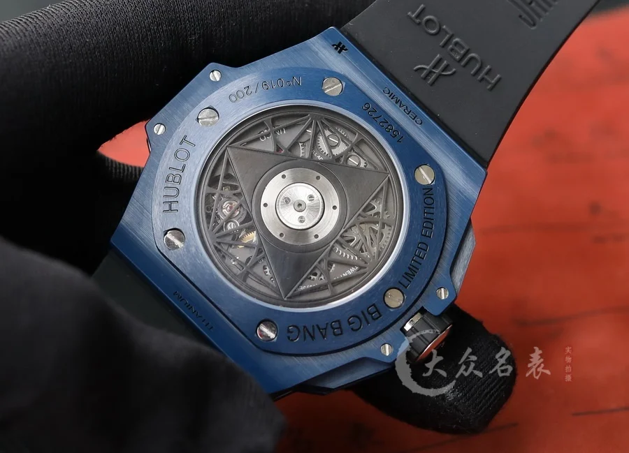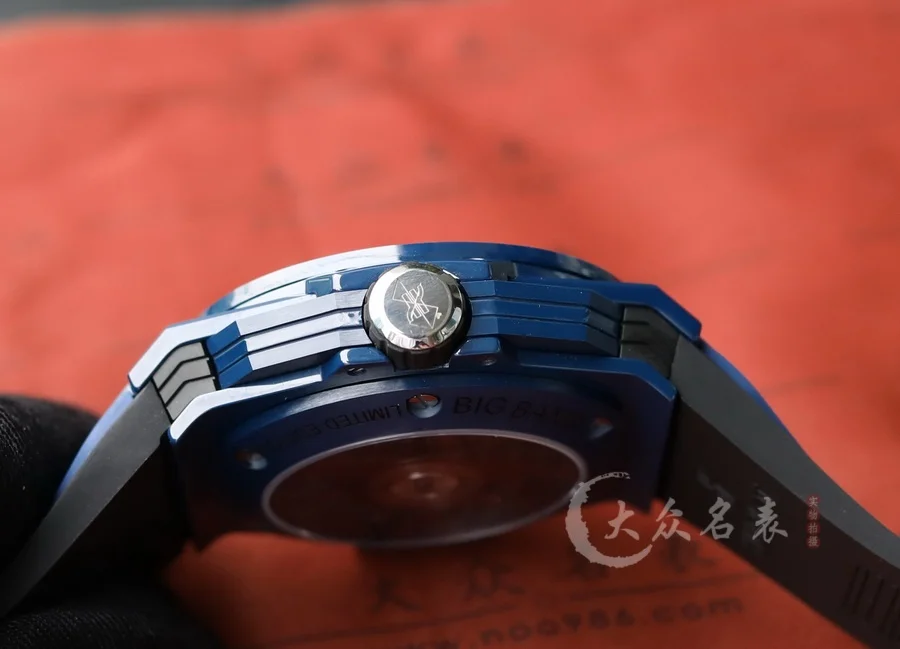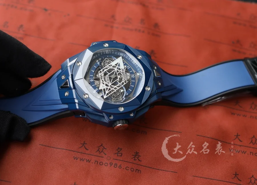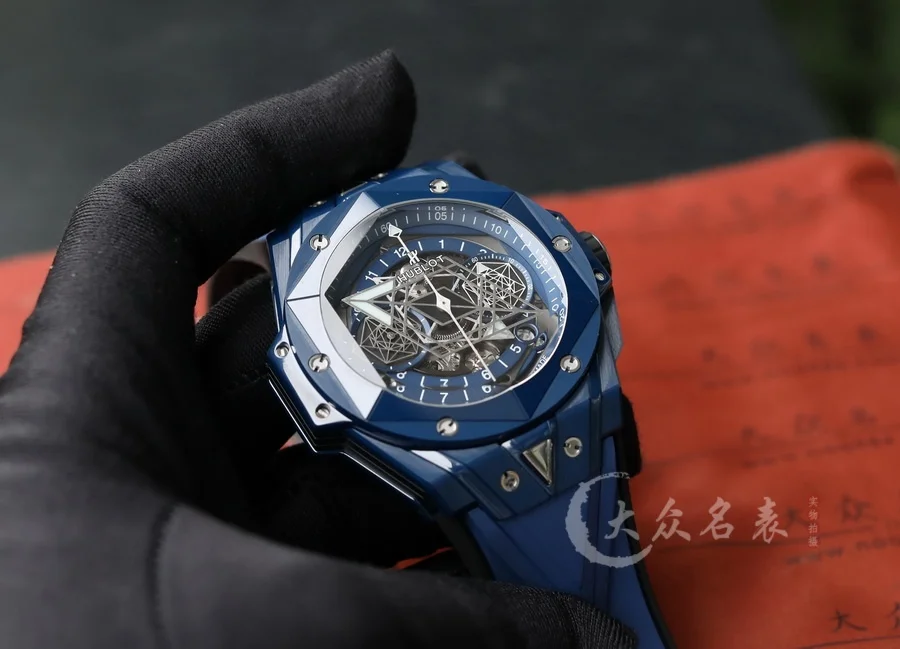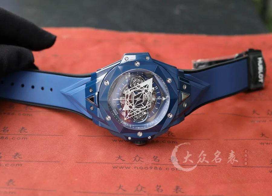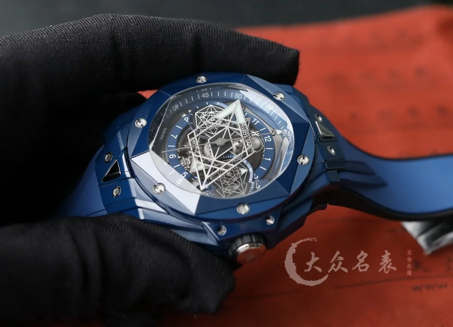 HUBLOT宇舶表全新Big Bang Sang Bleu II刺青二代腕表,恒寶最熱門款,史上最復雜陶瓷工藝重大突破。運用立體幾何圖形,呈現出精妙的浮雕效果和深邃質感,淋漓盡致地詮釋線條美學的不懈追求。表殼陶瓷材質多達12件,經過拋光、緞面、切片、雕刻、倒角以及刻面處理,呈現出交替疊加的六邊形、菱形以及三角形,營造出和諧迷人的視覺效果 標配定製恒寶專屬UNICO HUB 1240自動飛返計時機芯,業內唯一對版4.5字位鏤空日歷環與窗口,3字盤60分鐘計時,(註:市面7750機芯均只能計時30分鐘)8字位水平離合, 9字位小秒輪。同步原裝半牙型表冠刺青標誌永遠向上。 批邊藍寶石水晶表鏡,七彩紋指針質感無可挑剔 45mm 全部功能100%完美實現,需要溫馨提示各位,由於機芯改動較大,手表動力不足的時候需要定期為手表上鏈。