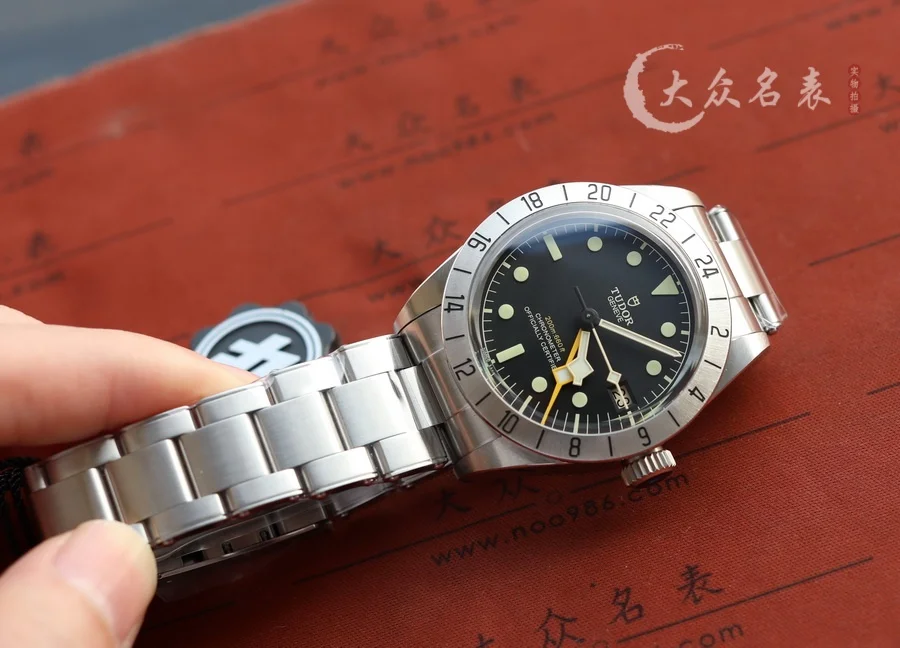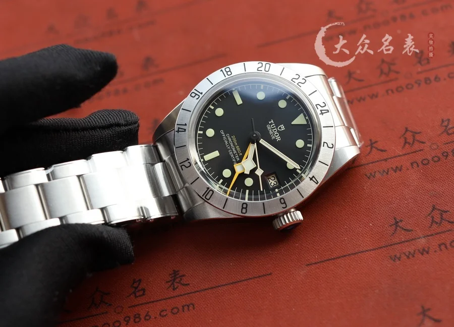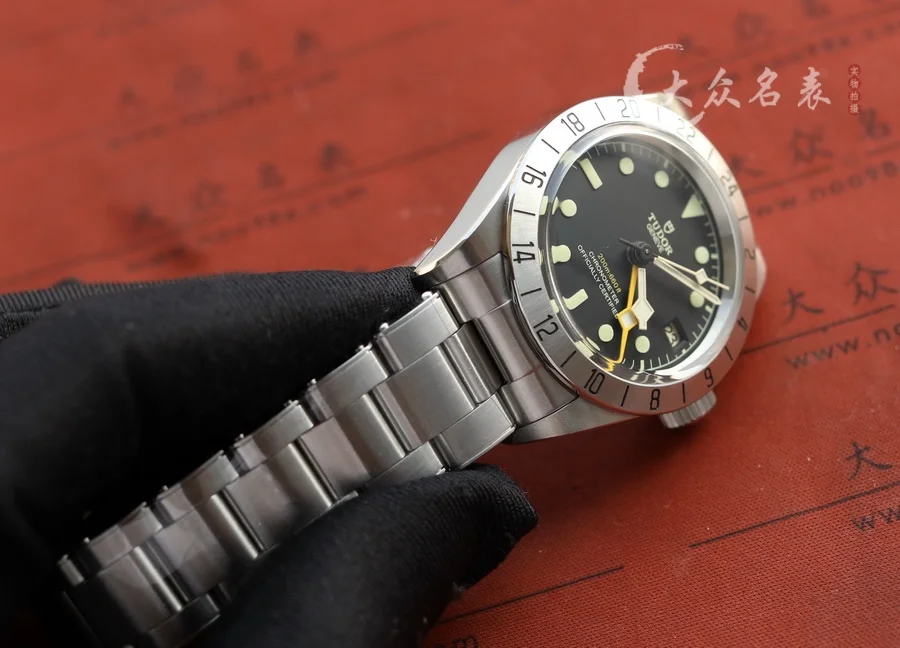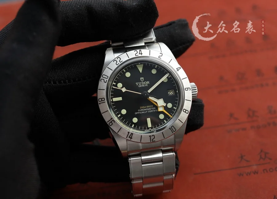 帝舵獨有的表盤設計,使用不含輻射的Super-Luminova夜光塗料做成整塊的刻度釘,沒有金屬邊框更顯簡潔,夜光效果更加明亮。除了常規顯示所在地時間外,這款腕表還配備了GMT功能,由較長的黃色雪花針和24小時固定刻度外圈共同指示。3點鐘方向的瞬跳日歷與可獨立調時的時針同步,在日常生活中非常實用。此外,這款腕表配備了帝舵「T-fit」快調裝置的新款「龜背」帶扣,該裝置設置五處孔位,調節長度可達8毫米,能滿足不同手腕尺寸的表友更加舒適的佩戴體驗。