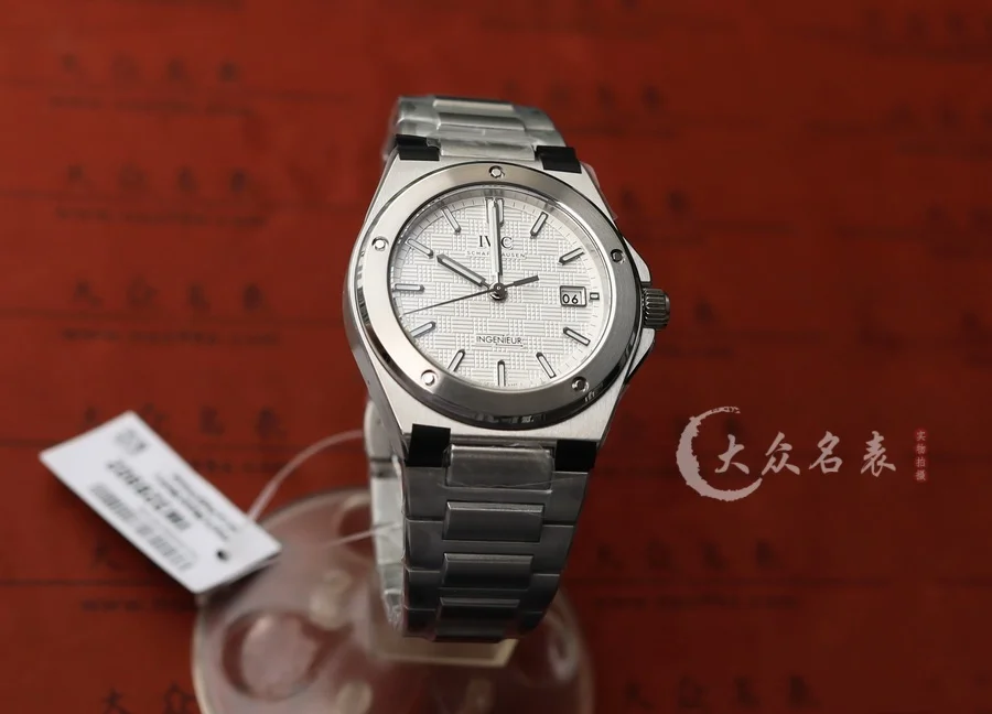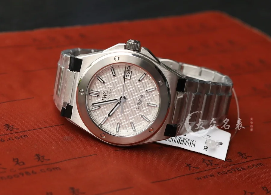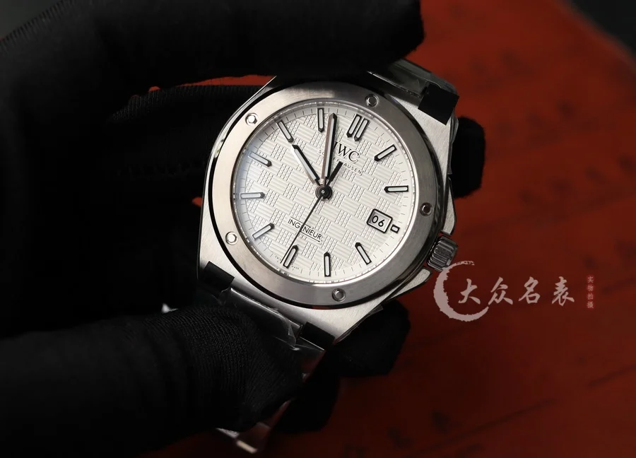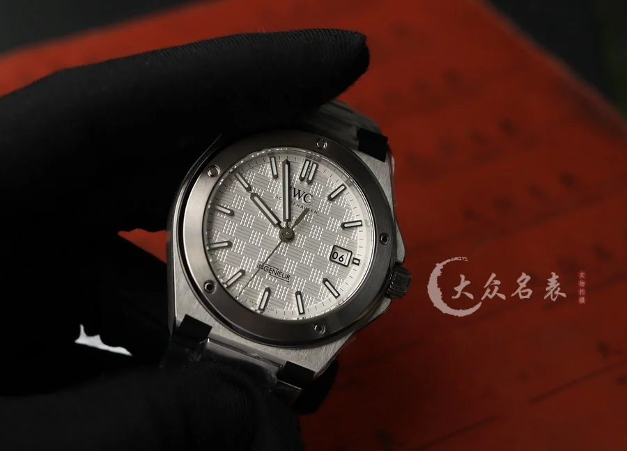 40mm 表殼融合垂直拉絲、環形拉絲及鏡面拋光工藝,精心重構的線條呈現更柔和流暢的輪廓。厚度為10.7mm。表帶側面光邊(表節轉角處)使用了CNC工藝 使得每一個表節做到齊整流暢。內影圈細致。叉板寬度5.5毫.表圈由5顆螺絲緊緊固定,表耳細節及H形表鏈采用更符合人體工程學的新設計,能夠更舒適貼合手腕。新作最特別之處在於表盤再現原版 Ingenieur SL 使用的「網格」飾紋,製作時需要在鐵質表盤底座上沖壓形成凹雕紋路,再經過鍍鋅處理。該圖案由相互垂直的細線組成,壓印於軟鐵坯件後再經電鍍工藝處理。該圖案覆蓋整個表盤內部區域,而環繞分鐘刻度的表盤外部區域仍然保持光滑。IWC標識的比例及其在表盤上的位置經過精心調整,可以確保它與「網格」圖案嚴密對齊。