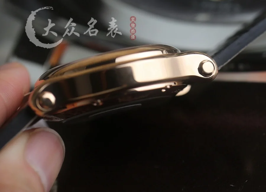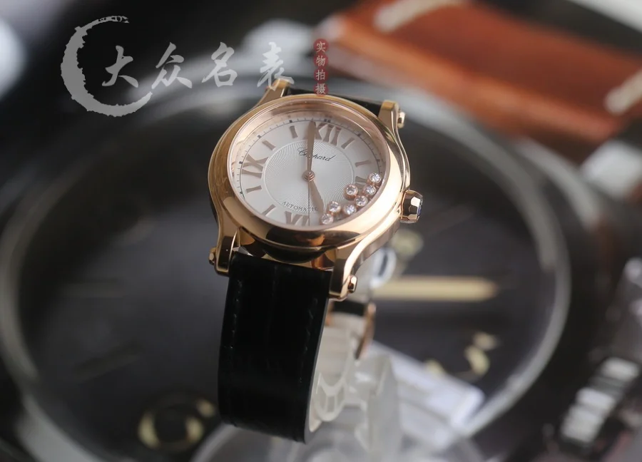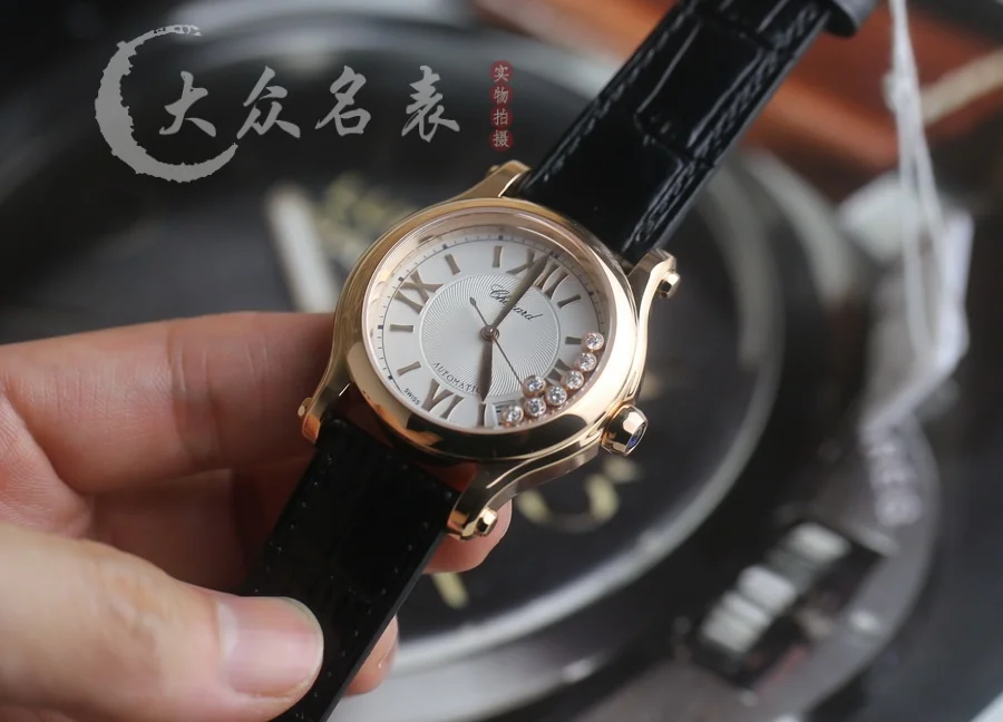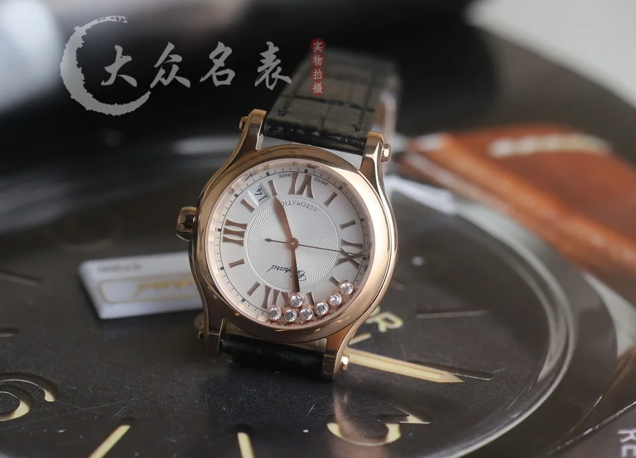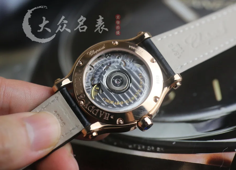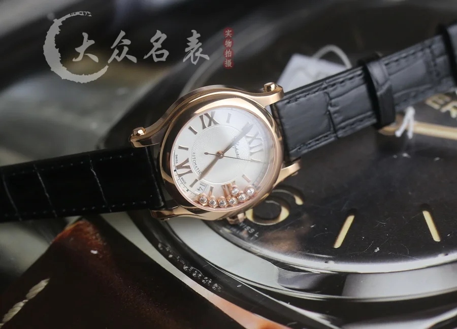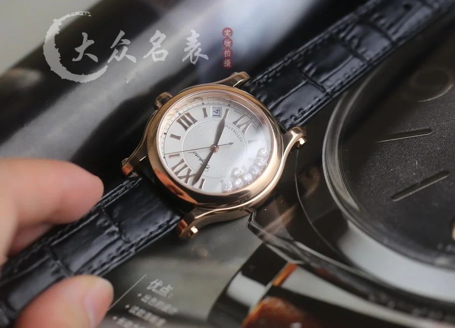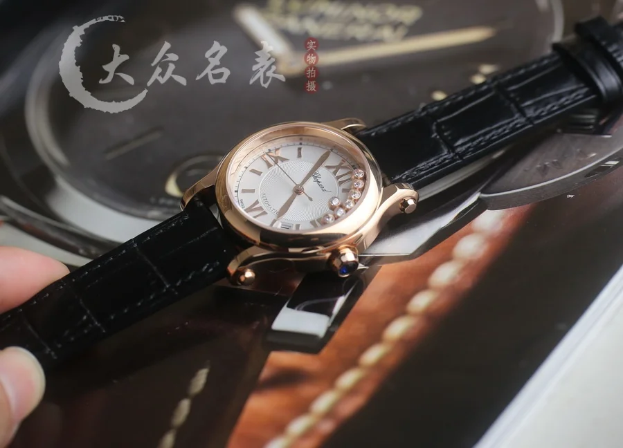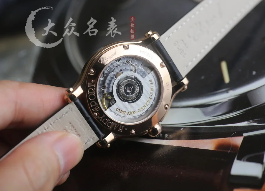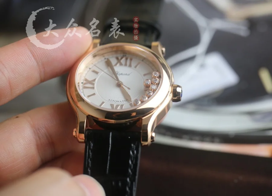 手表直徑36mm,屬於蕭邦快樂的鉆石系列,值得註意的是,36mm采用7鉆的搭配,而小尺寸常采用5鉆的搭配,各位可以以此區分手表尺寸大小。表盤的鉆在兩塊藍寶石鏡面的夾層上,並且鉆的底部采用尖頂設計,擺動手腕的時候鉆石會隨機流動,這個也是此品牌的設計特色。手表機芯采用海鷗2892,厚度等都和正品一樣的,並且標配了鱷魚皮,此款是金色款,這個系列有非常多的搭配,並且有更小的表盤尺寸選擇。