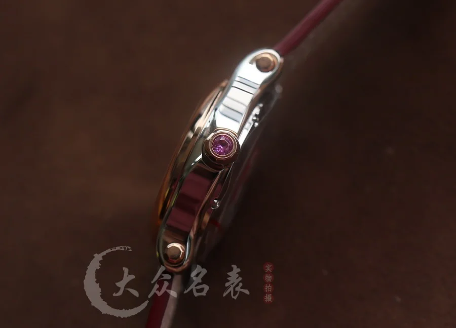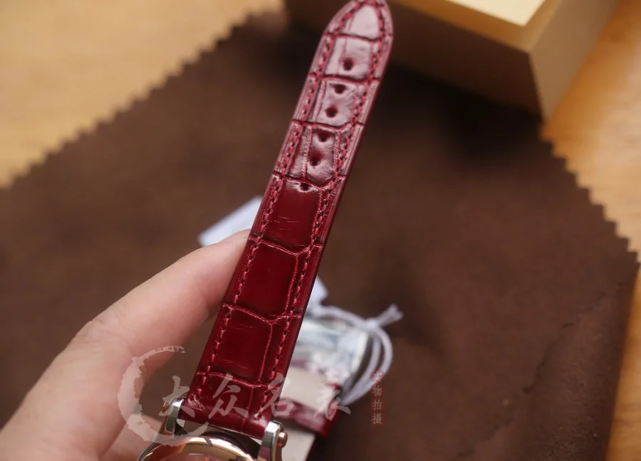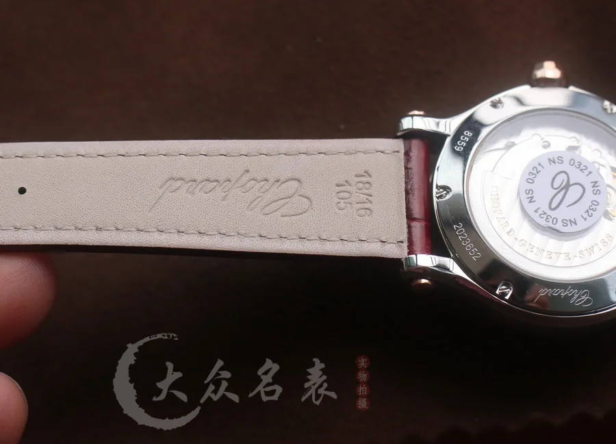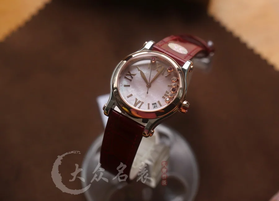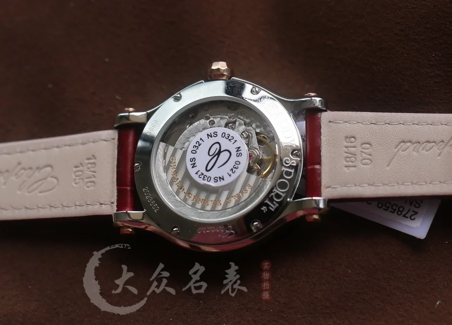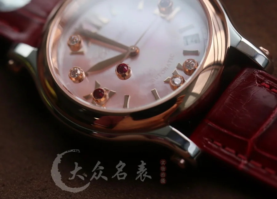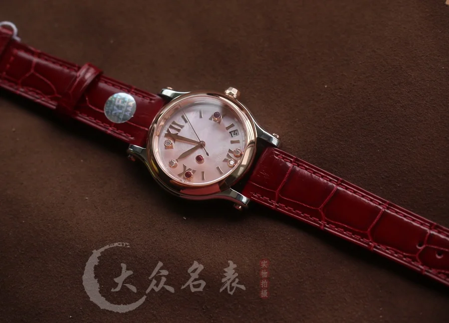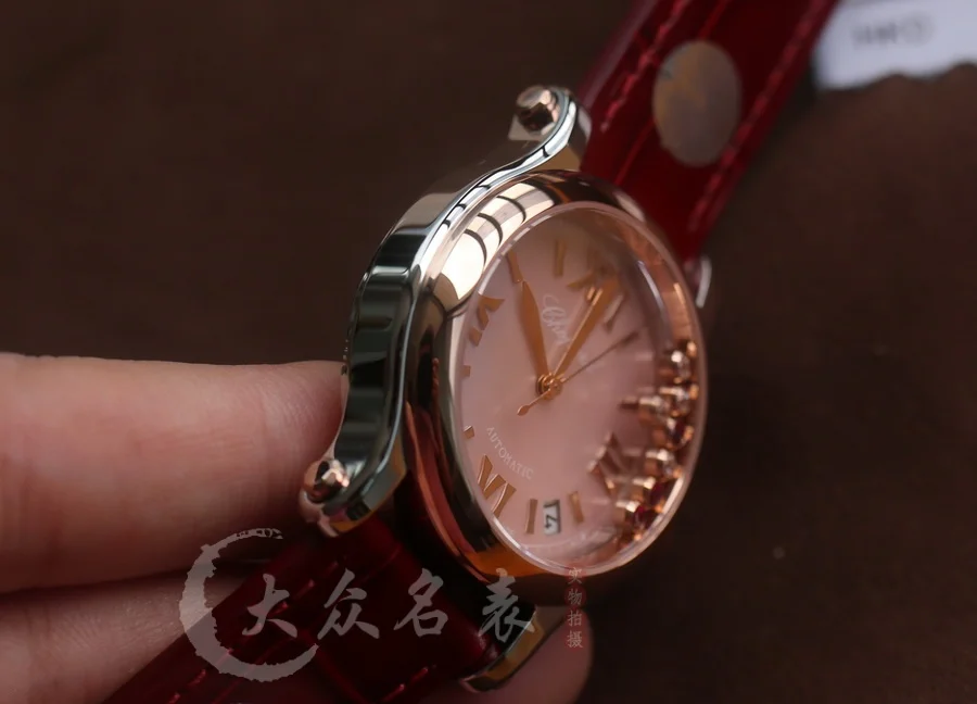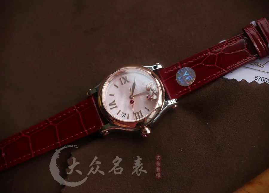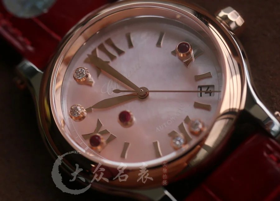手表直徑36mm,屬於蕭邦快樂的鉆石系列,值得註意的是,36mm采用7鉆的搭配,而小尺寸常采用5鉆的搭配,各位可以以此區分手表尺寸大小。表盤的鉆在兩塊藍寶石鏡面的夾層上,並且鉆的底部采用尖頂設計,擺動手腕的時候鉆石會隨機流動,這個也是此品牌的設計特色。手表機芯采用海鷗2892,厚度等都和正品一樣的,並且標配了鱷魚皮,此款合作款,表盤采用了粉色貝殼面設計。