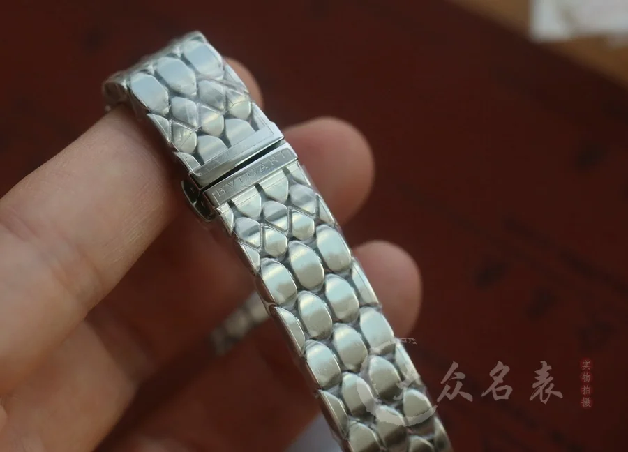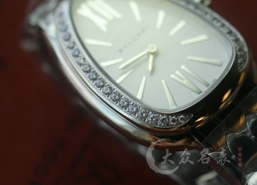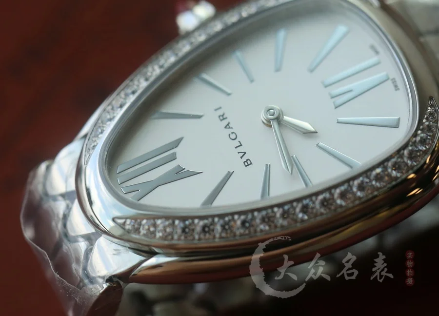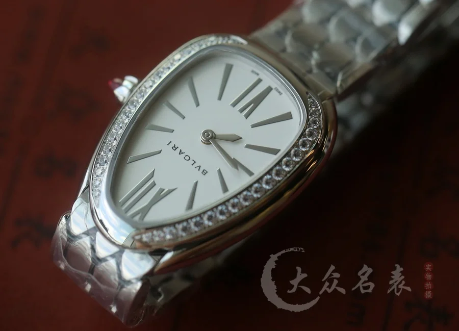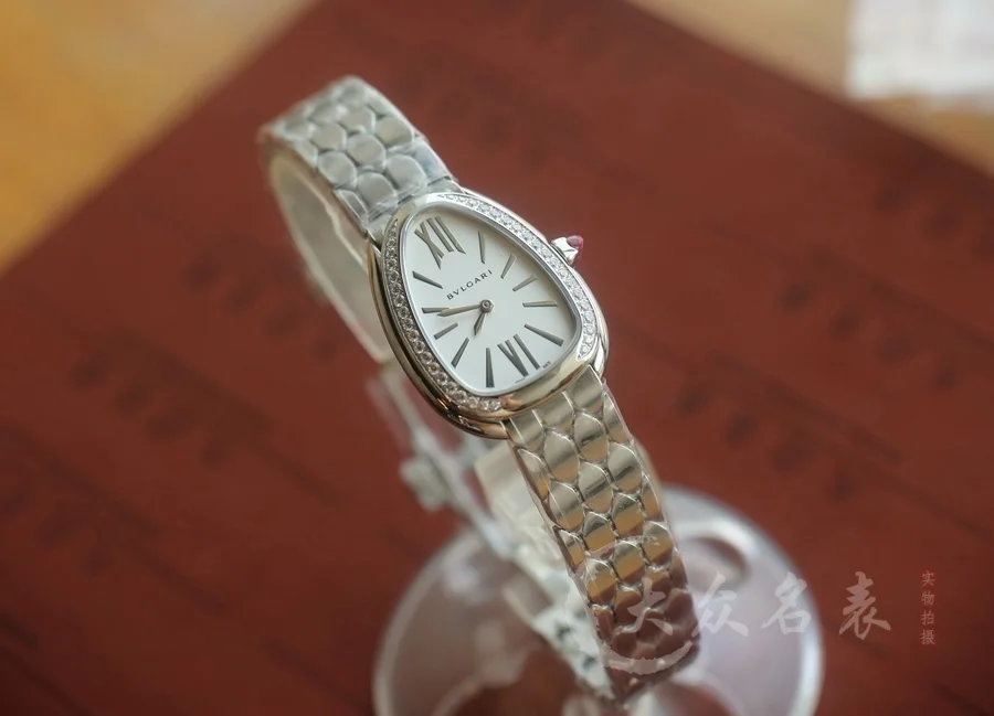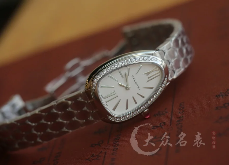 寶格麗SerpentiSeduttori鎏金腕表,尺寸33毫米、厚度6.85。精鋼表冠,飾以1顆凸形蛋面切割粉紅碧璽,銀色蛋白石表盤、簡潔大氣。圈口鑲嵌38顆真鉆、光芒四射。全新設計的六邊形蛇鱗狀精鋼表鏈、柔韌靈活、整條表帶由223個鋼件拼組而成、每一件都獨立打磨加工、工藝極其復雜,搭配折疊式表扣。配備寶格麗正品一致自製專用高精度石英機芯。對於看膩了藍氣球主流女裝表的朋友不妨關註這款。