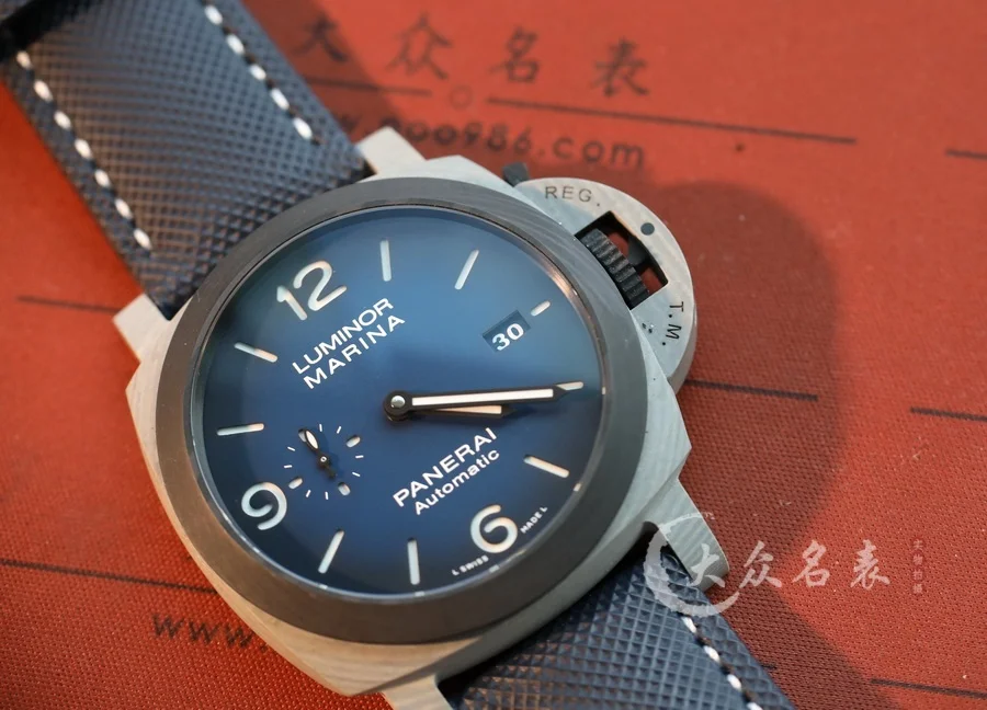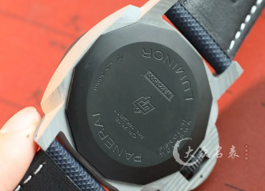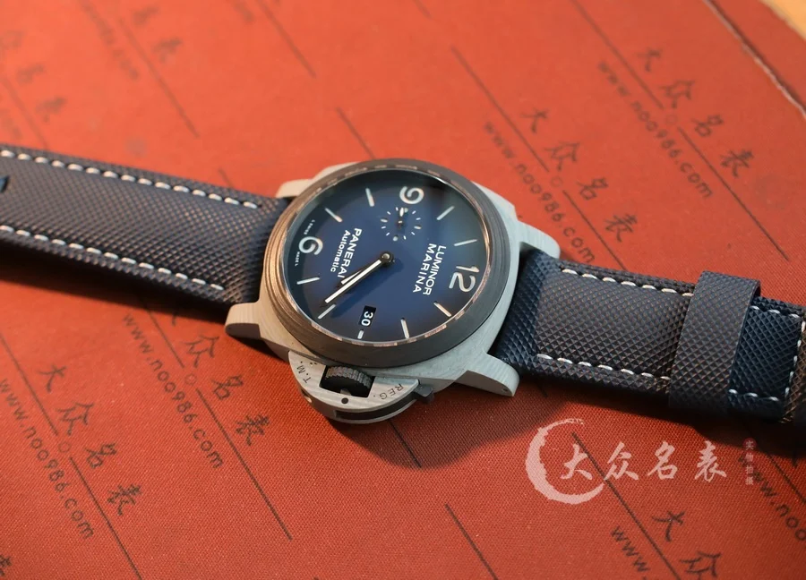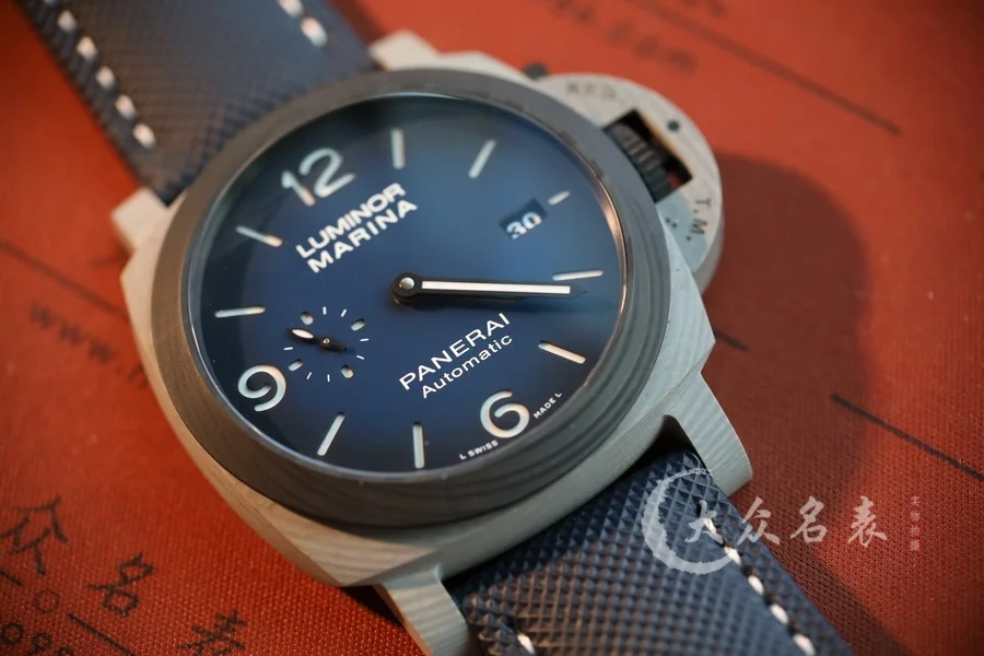 納海最新碳纖維材Fibratech—碳纖維新的裏程碑!VS沛PAM1663腕表!碳纖維橫紋質地像巖石一樣的啞光灰色質感,漸變「煙熏藍」面盤與表殼啞光質地相呼應!