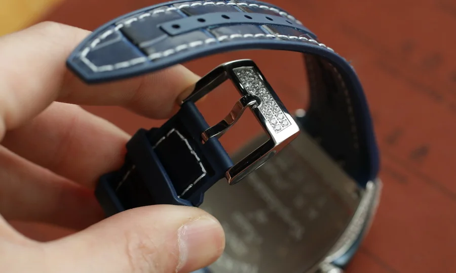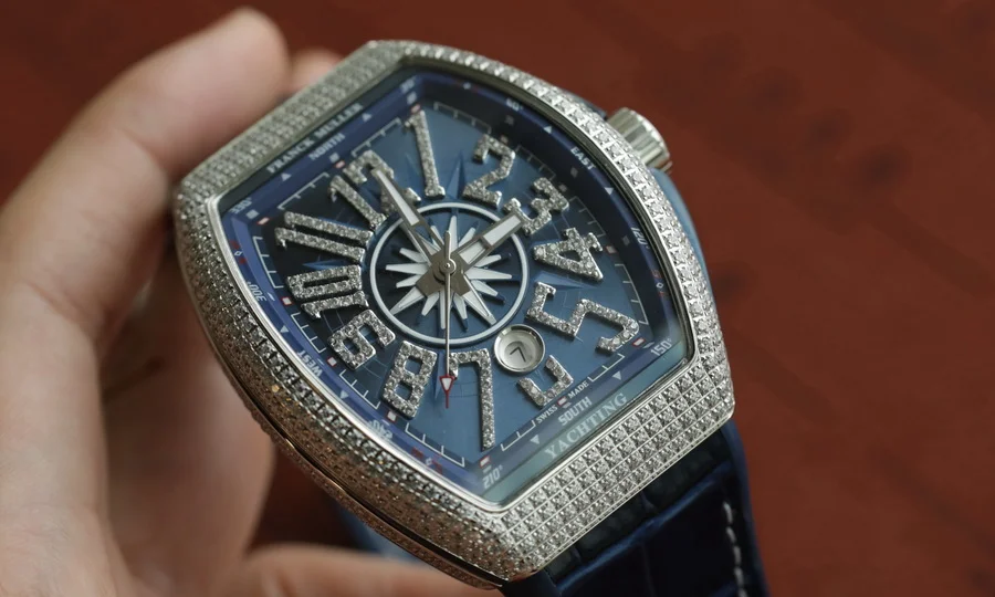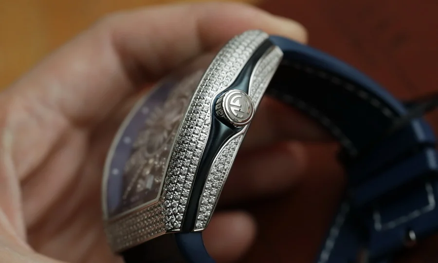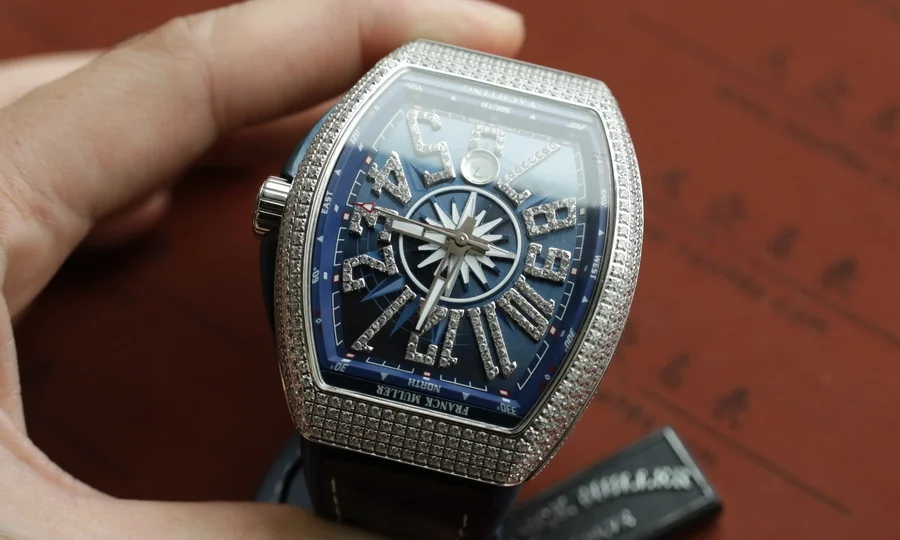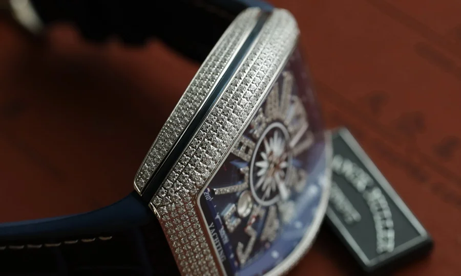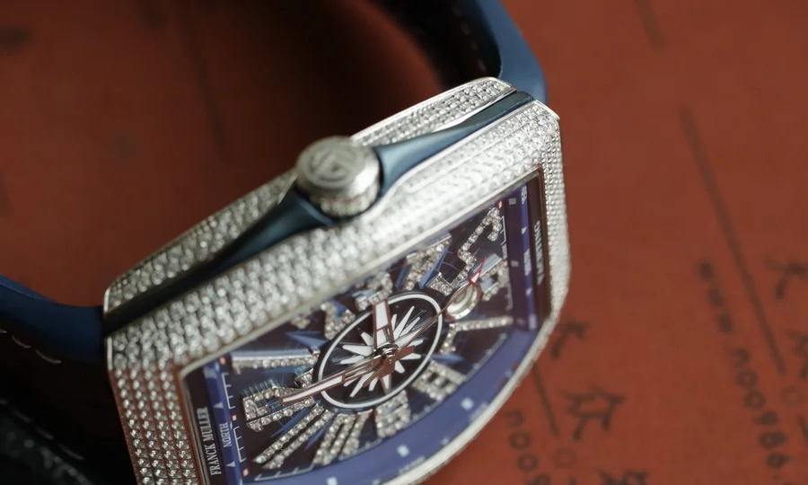 腕表尺寸45毫米。微弧式枕型表殼優雅貼手,表殼由內外八個配件組合一體,精密度天衣無縫。全部數據均按照正品一比一開模定製。是市面上唯一可以叫板正品的最高級別克隆體。藍色盤面顏色與正品一致,效果沈穩內斂,盡顯大牌風範。表盤上的數字刻度因為每一個都不同,所有刻度全部需要獨立開模訂製,耗時耗力,潛心研發。雙層表帶結構同步正品,正面采用人工纖維,背部則是天然橡膠,佩戴舒適冬暖夏涼,舒適感極佳。搭配FM經典折疊表扣。可完美通用原裝。日本美優達9015機芯,質量穩定,走時精準,返修率極低。這款采用鑲鉆設計,豪華感十足。