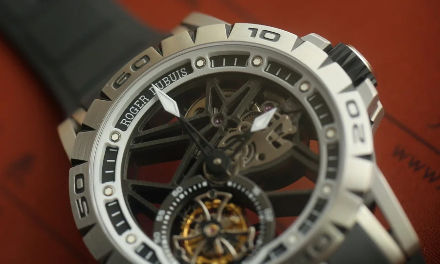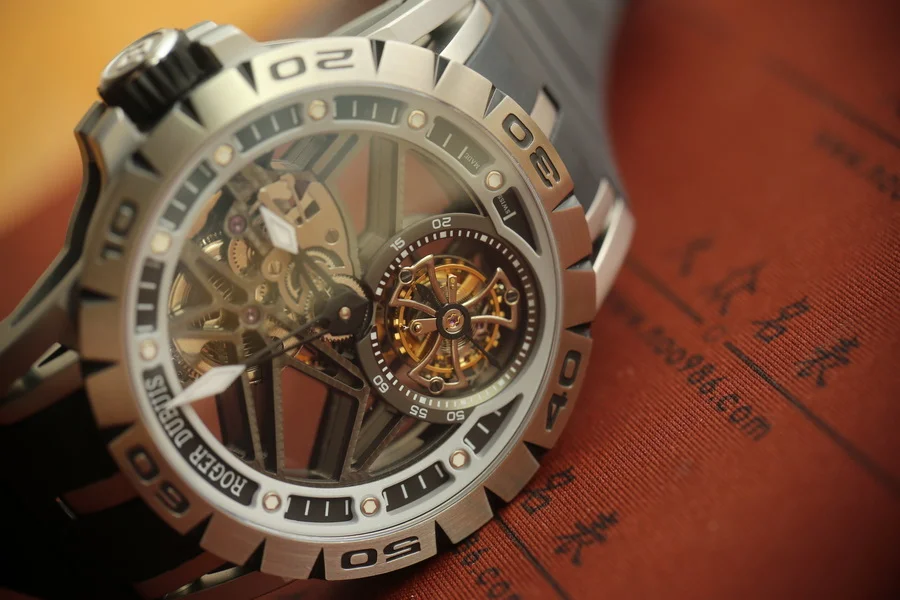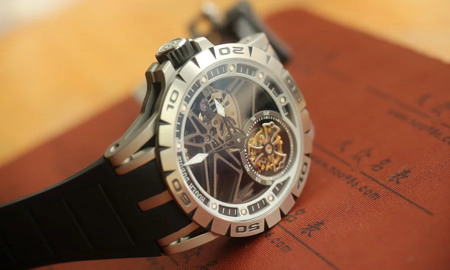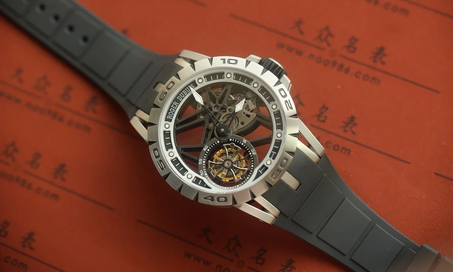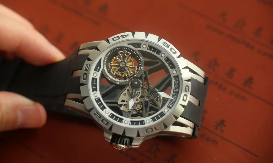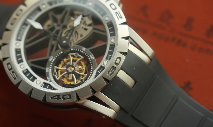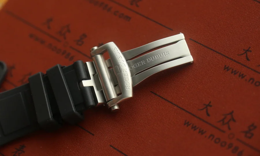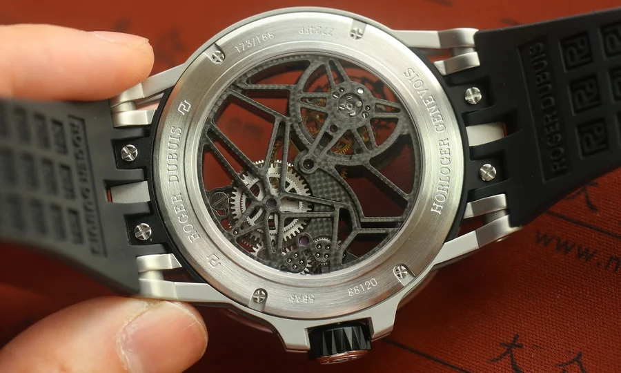 3.表盤:采用了鏤空表盤,夜光刻度,黑色DLC塗層鈦合金的秒盤印有黑色分鐘圈和Roger Dubuis(羅傑杜彼)字樣。指針覆有夜光塗層,讀時簡單明了。