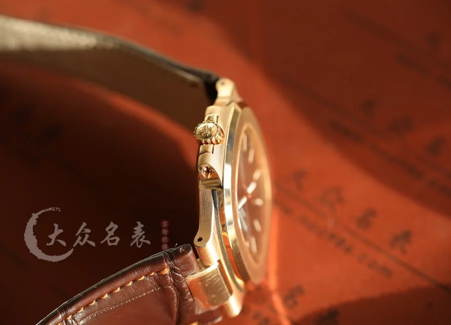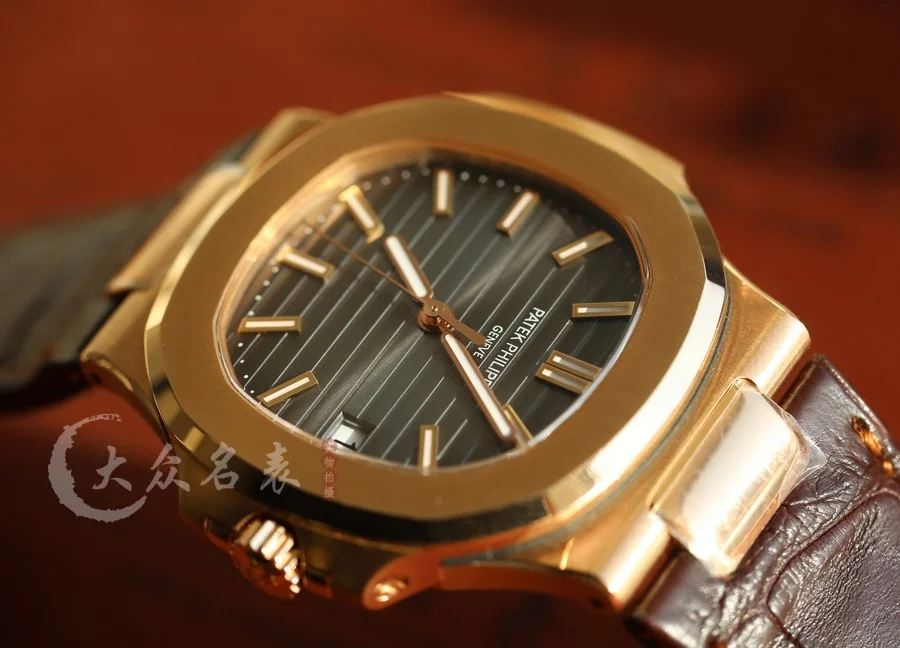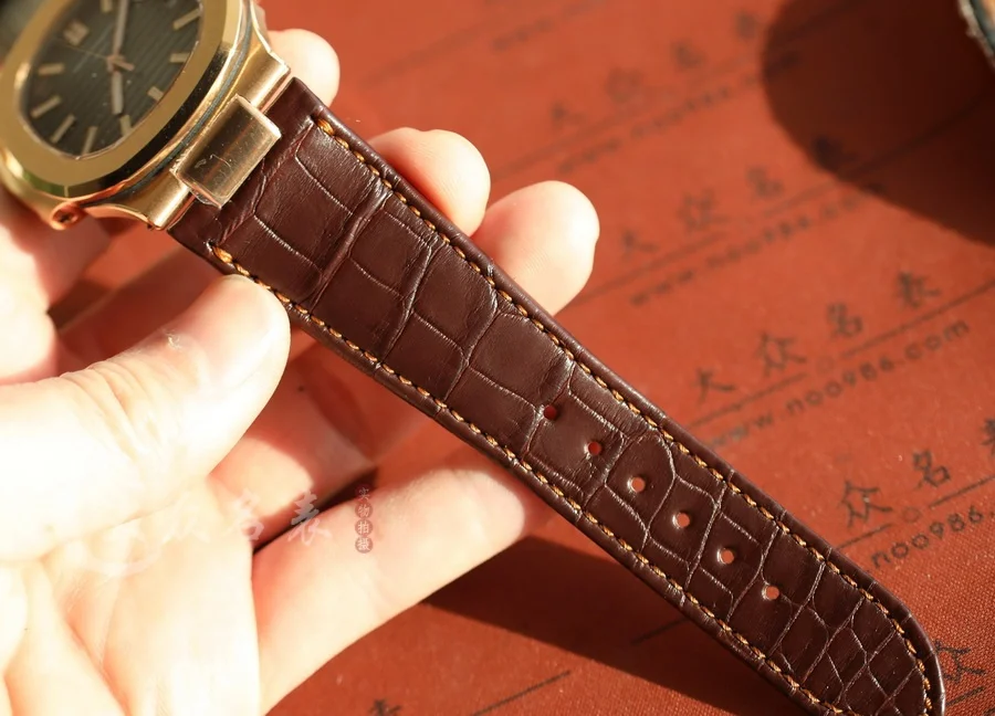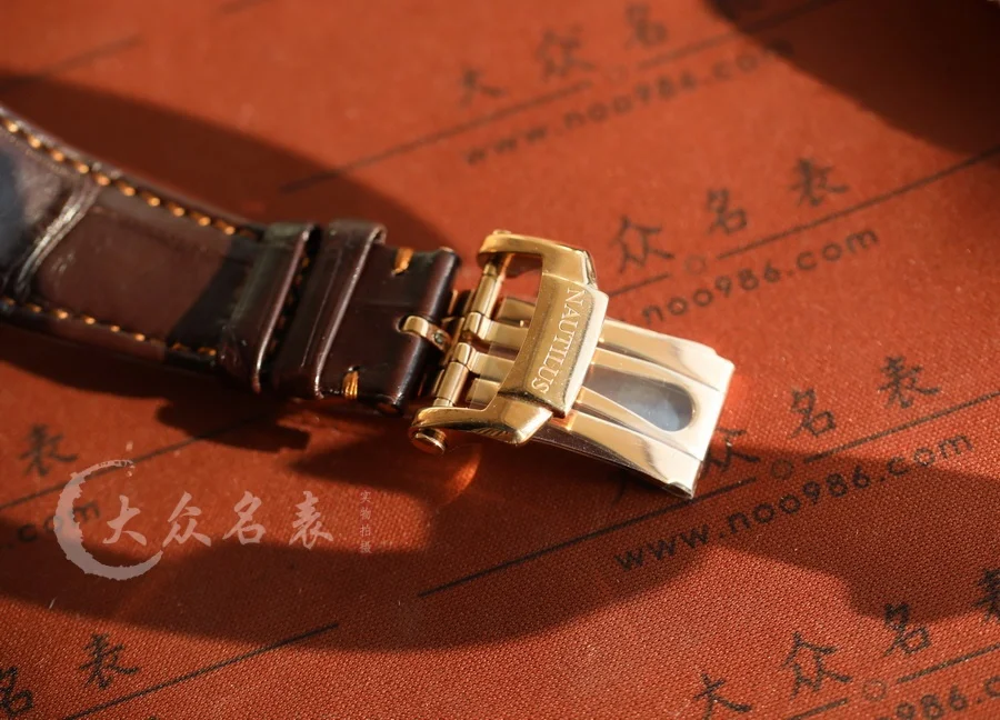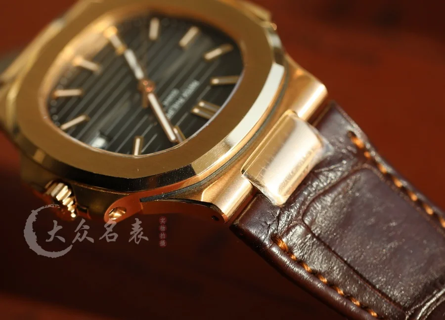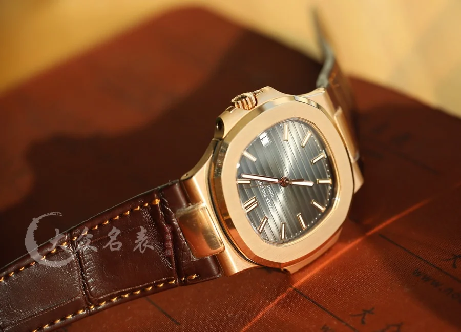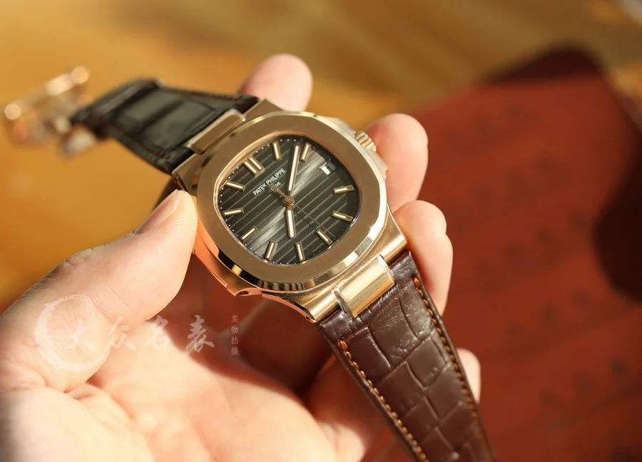 這款玫瑰金的鸚鵡螺表同樣采用了標配鱷魚皮