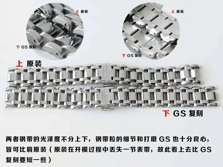 【鋼帶】波浪型的表帶動感貼手,光澤流盼。每一粒表帶截,都經過GS製表師精心細致的打磨,確保光澤和形狀完美無瑕,吻合原版。