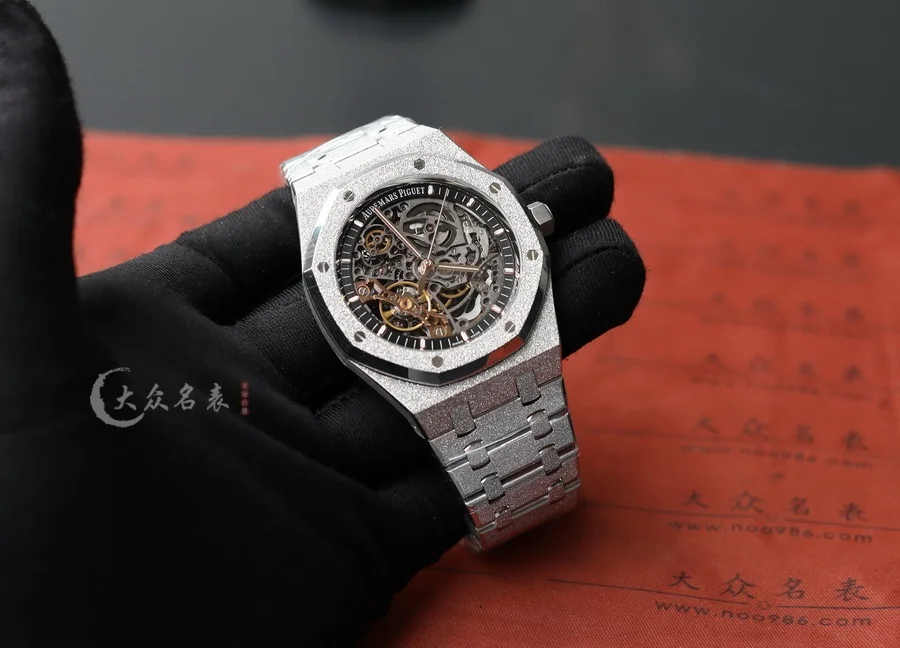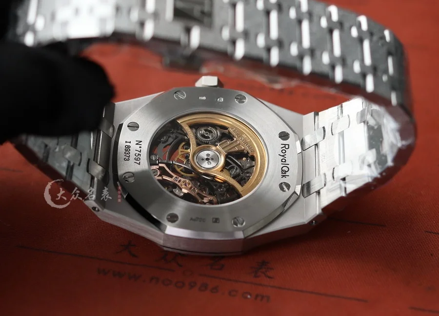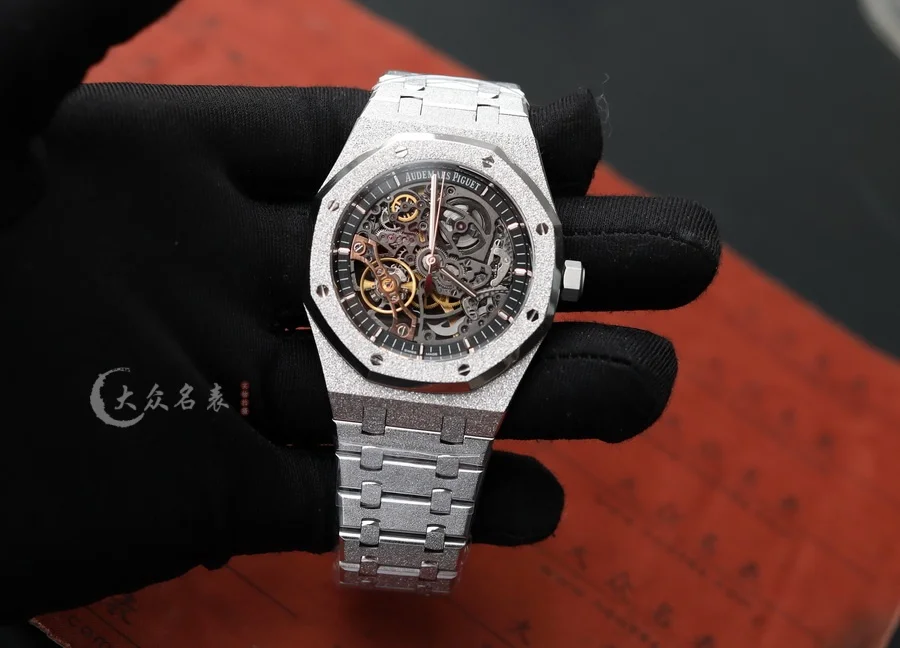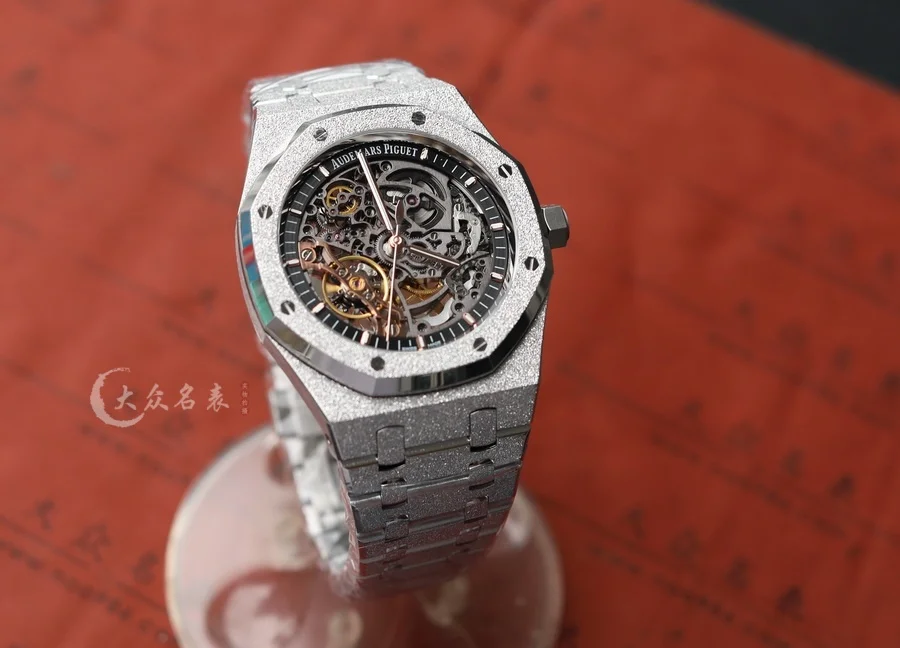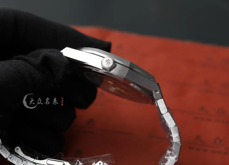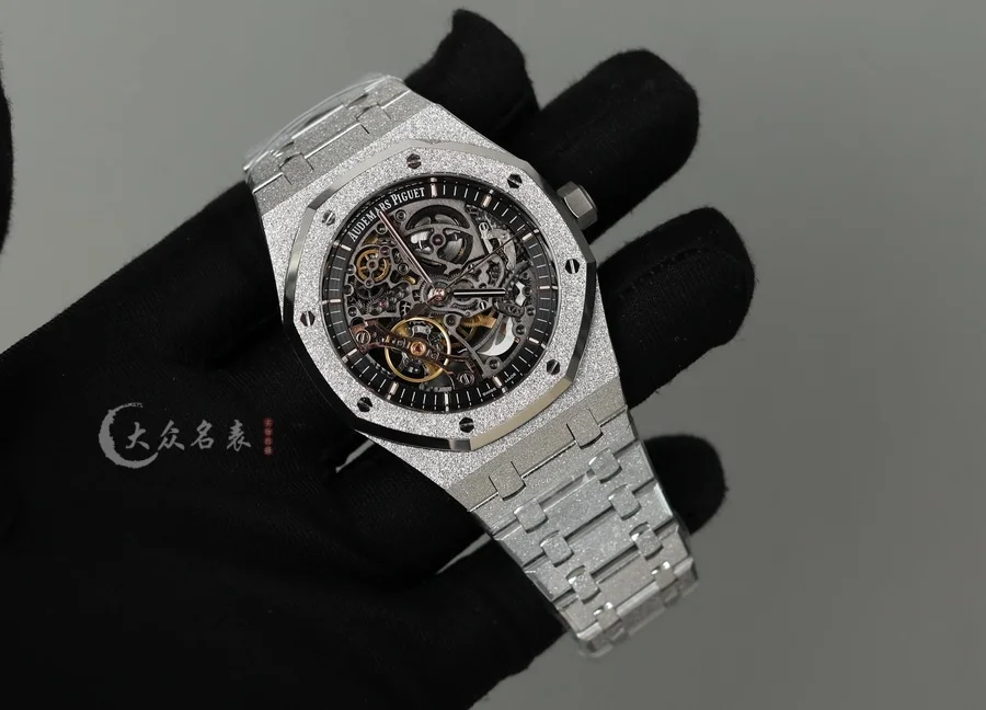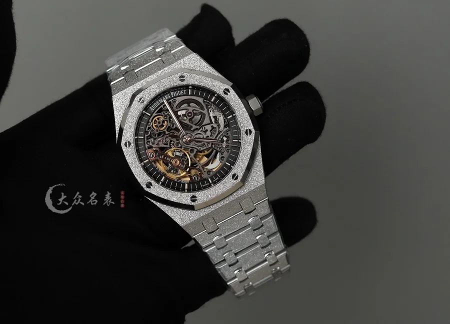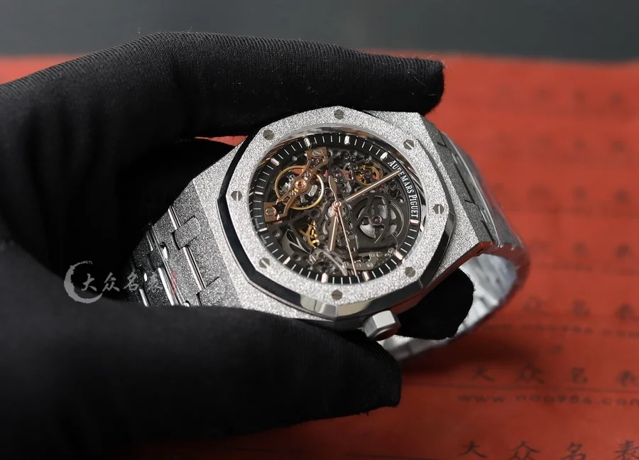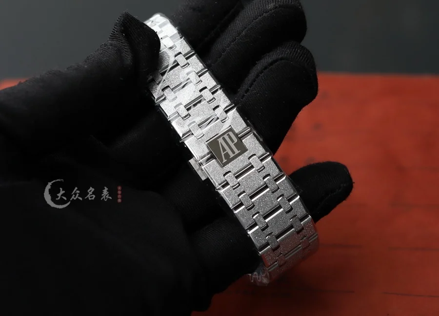 整表全新開模的「霜金」工藝處理。ZF 將金錘技術(也稱為佛羅倫薩技術)運用於製表工藝,將皇家橡樹獨特表殼和表鏈構造的表面處理工藝而產生的令人嘆為觀止的閃閃發光,面臨的主要挑戰是在整表上應用這種表面處理技術,而不改變定義皇家橡樹形式的簡潔線條,ZF廠經過數月的反復試驗,才改變了金屬表面,使其在捕捉光線時會閃閃發光,同時又保留了手鏈的柔軟性和柔韌性。這是一個非常微妙的煉金術,什麽也沒添加,什麽也沒有刪除,但是手表卻變了。(以上細節如見實物更是驚艷)。