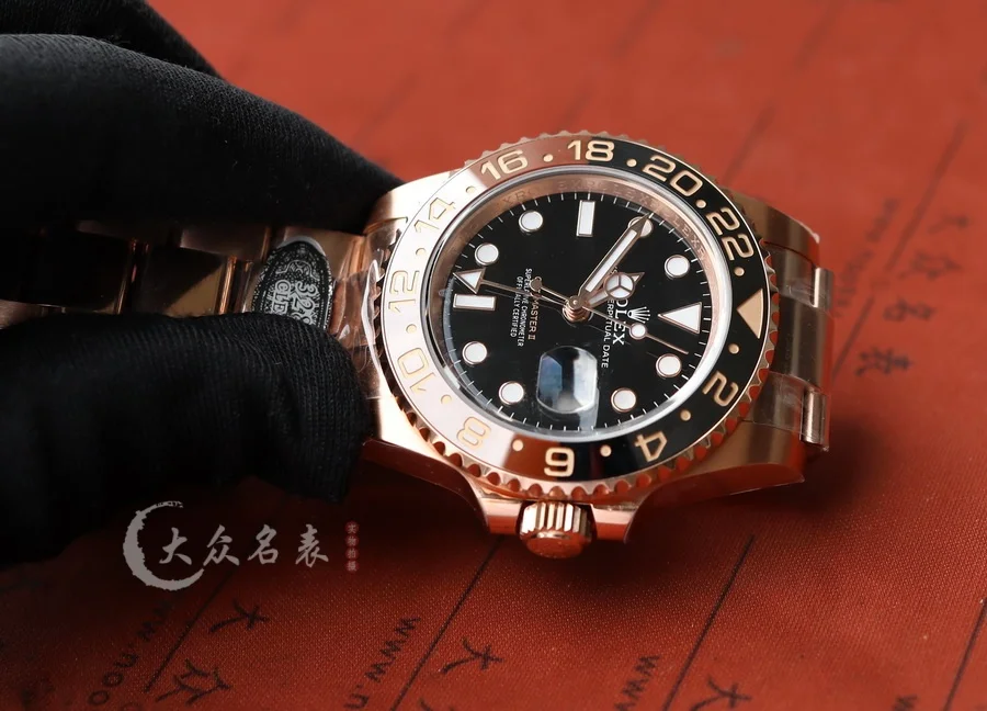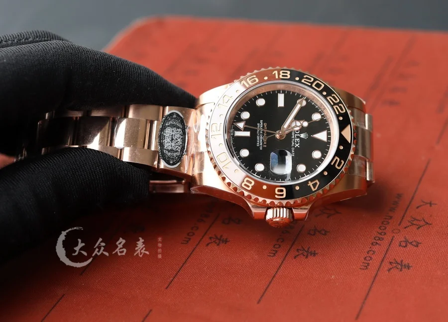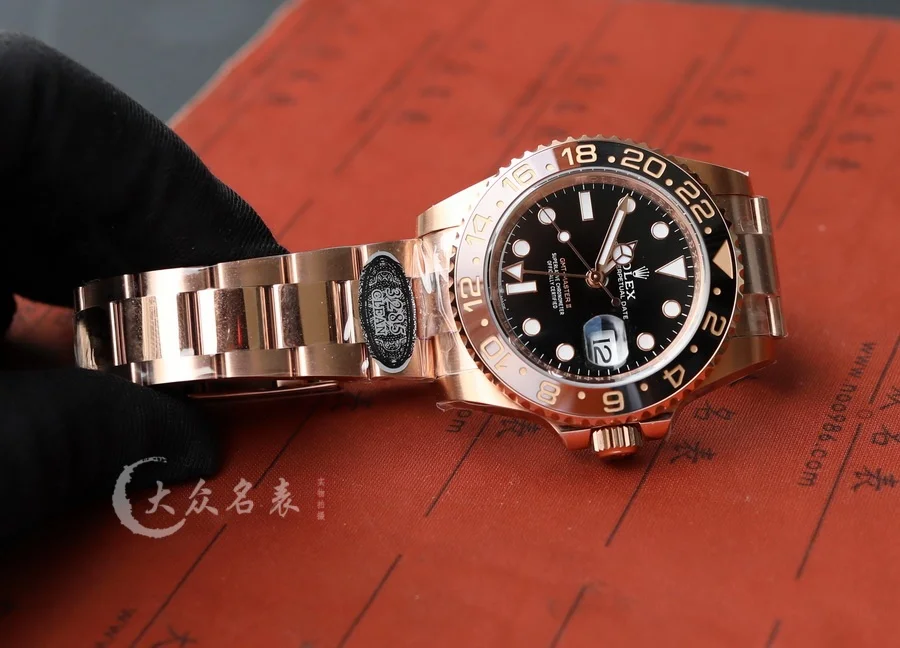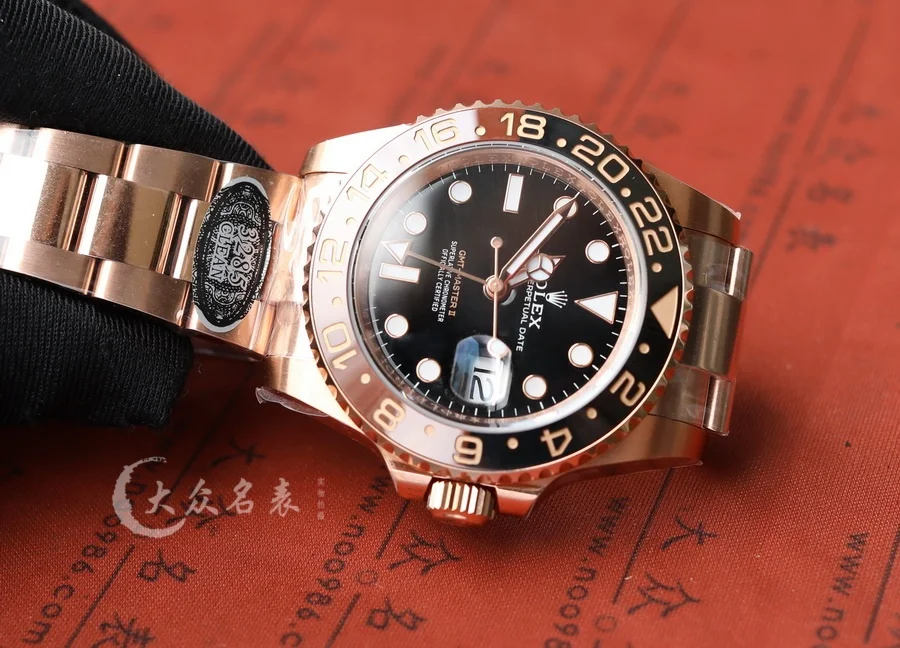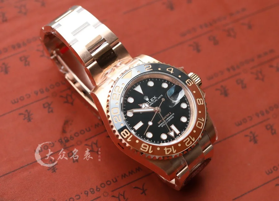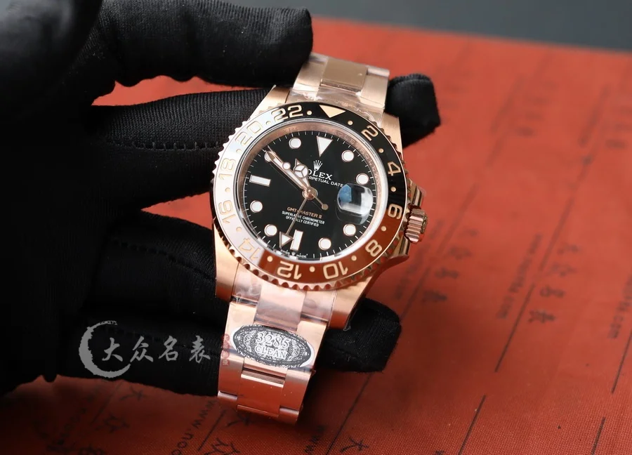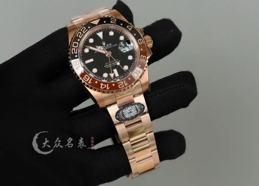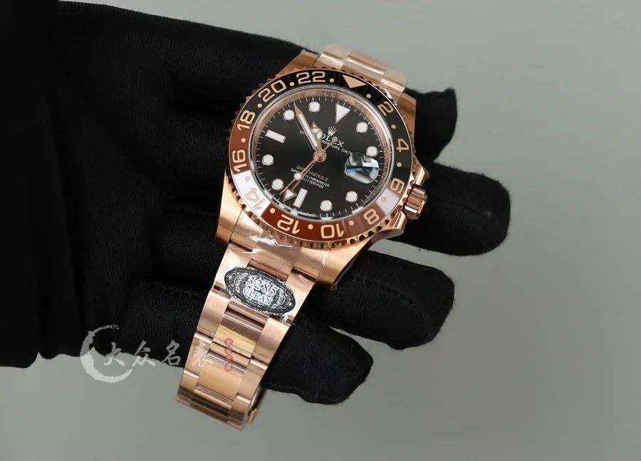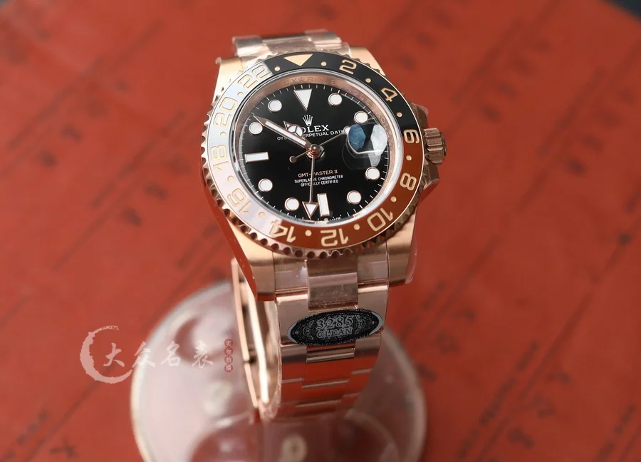 全金色的沙士圈,機芯采用70小時動力的3285,外殼為全玫瑰金配色,搭配非常豪橫的一款GMT。