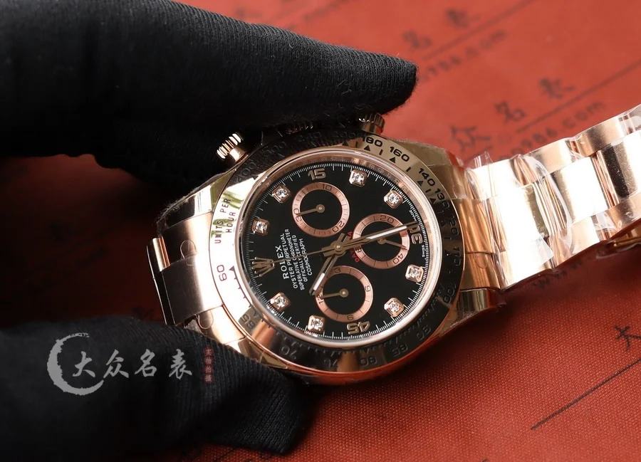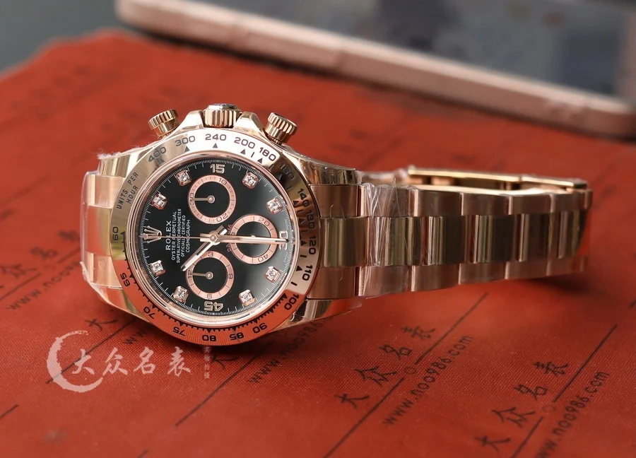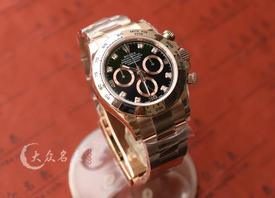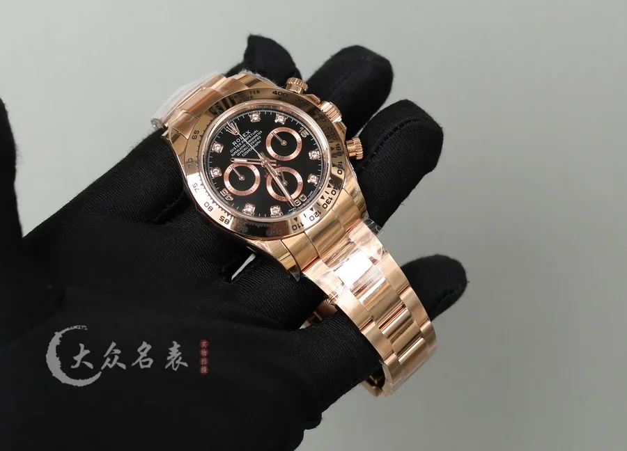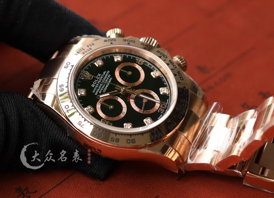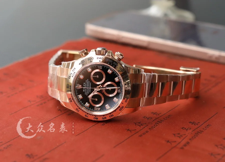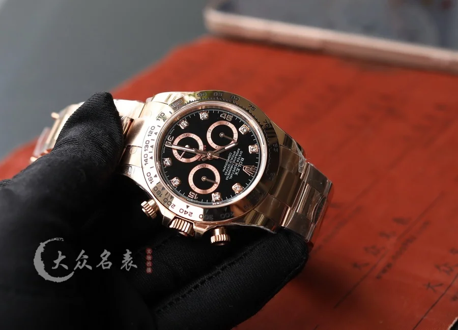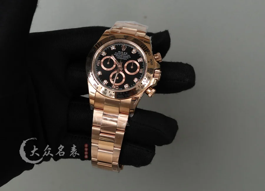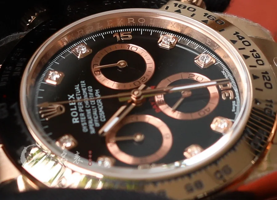 這款手表采用全玫瑰金的設定,黑面設計,時標鑲鉆。復刻Cal.4130機芯。復刻的4130和4131機芯沒有本質的區別,前者反而更有性價比。