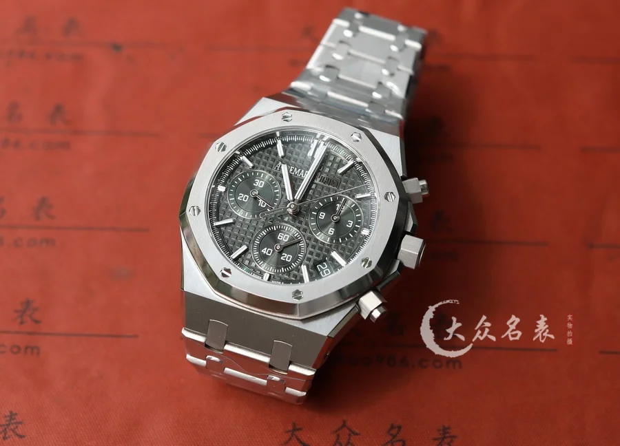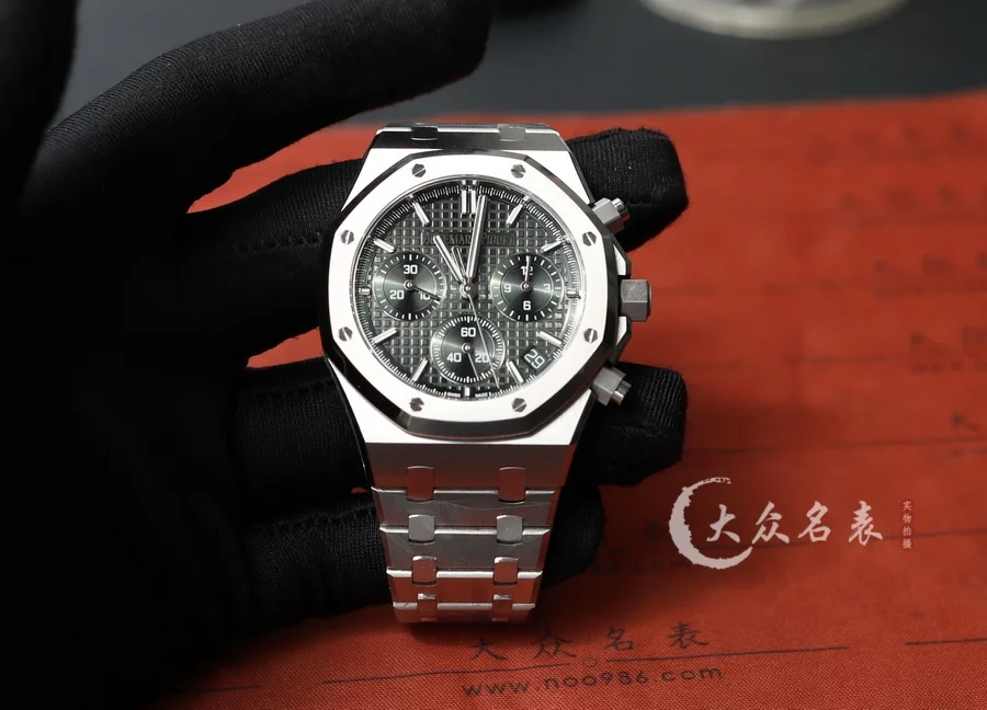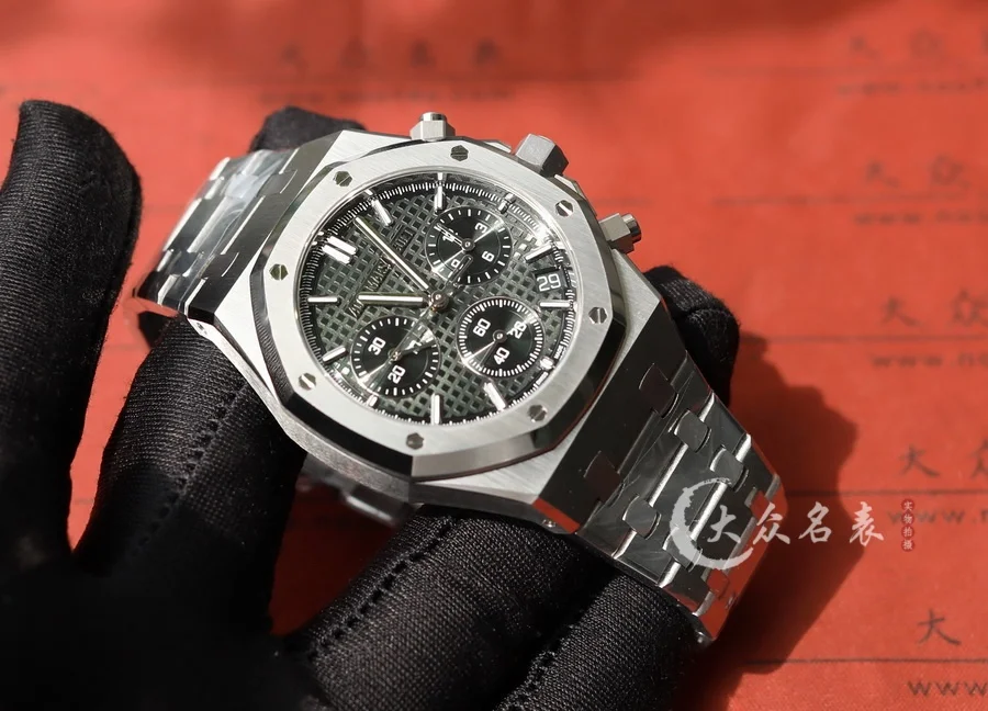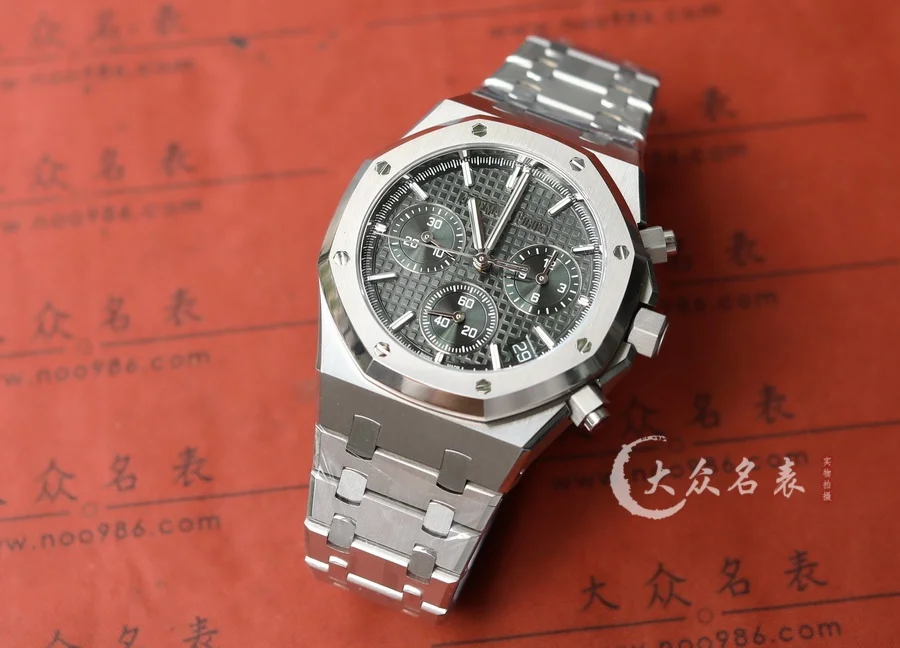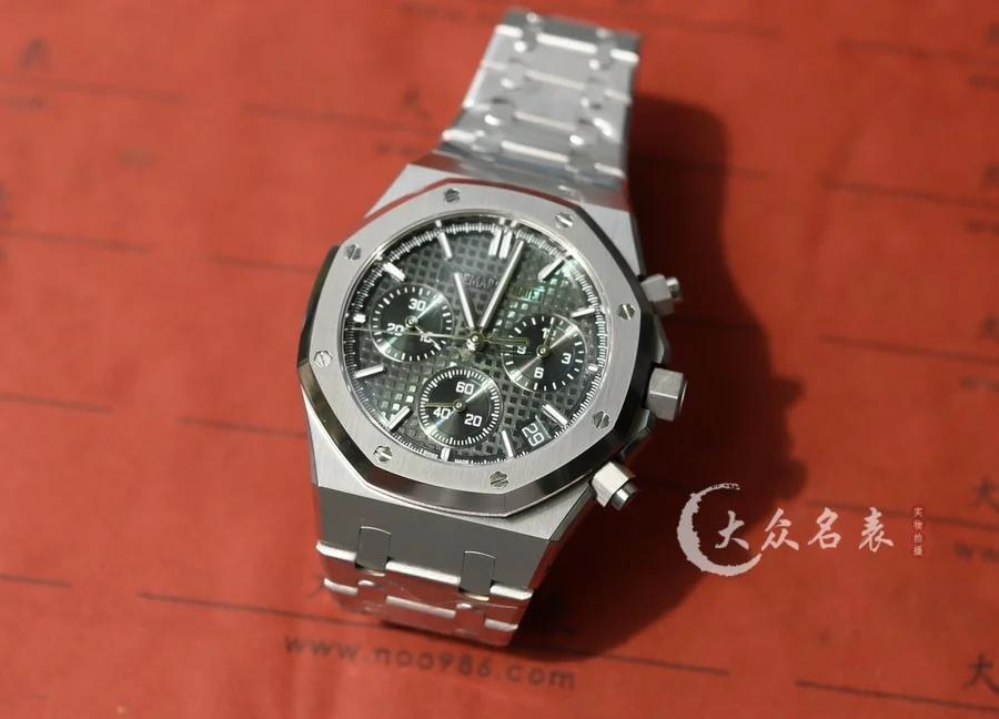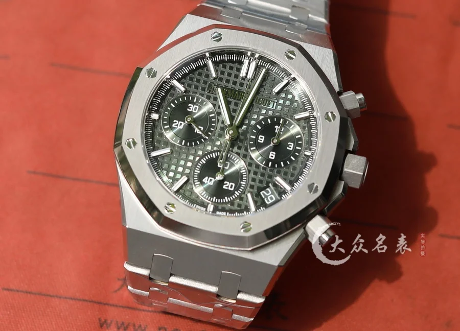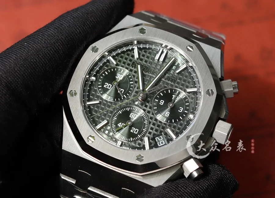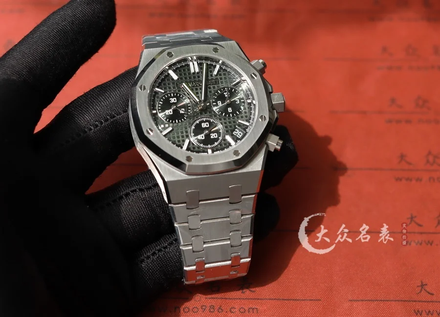 這個系列一直也有廠家做,但是以前的版本一直停留在7750機芯基礎上,7750本來沒問題,但是這款機芯應用在背透款手表上面就必須套假甲板,就顯得非常假並且機芯需要加厚。所以計時款的AP OAK系列我們都沒有分享。今日帶來的完美版是來自於APS,這款機芯是從新開發的,如果買了的表友可以發現背面機芯都是真齒輪,開動計時/關閉,裏面齒輪都是看得到聯動的。如果你喜歡計時AP,APS廠的版本值得選擇。下圖為綠色盤面。